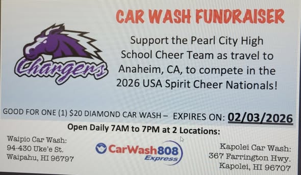 Pearl City High Cheerleaders selling Car Wash 808 Tickets. 1 for $20.00 or 2 for $30.00. Fundraising for Cheer Competition in February in Anaheim, CA