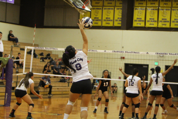 The Pearl City Lady Chargers defeated the Radford Lady Rams 21-25, 25-23, 20-18 in Oahu Interscholastic Association Division 1 Girls Varsity Volleyball on Thursday, September 29, 2016 at Pearl City High School.